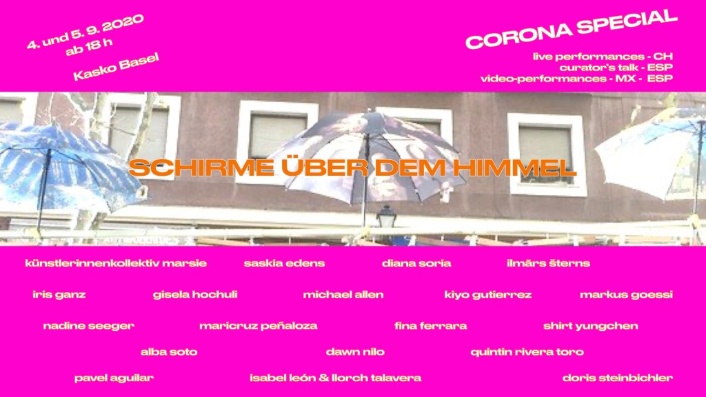 The 11th PERFORMANCE REIHE NEU-OERLIKON which takes place on 29 August 2020, should also this year be attended by artists from Mexico, Spain and Switzerland. Some of them would also be part of “Schirme über dem Himmel“ at Kaskadenkondensator, in Basel and would show solo performances.